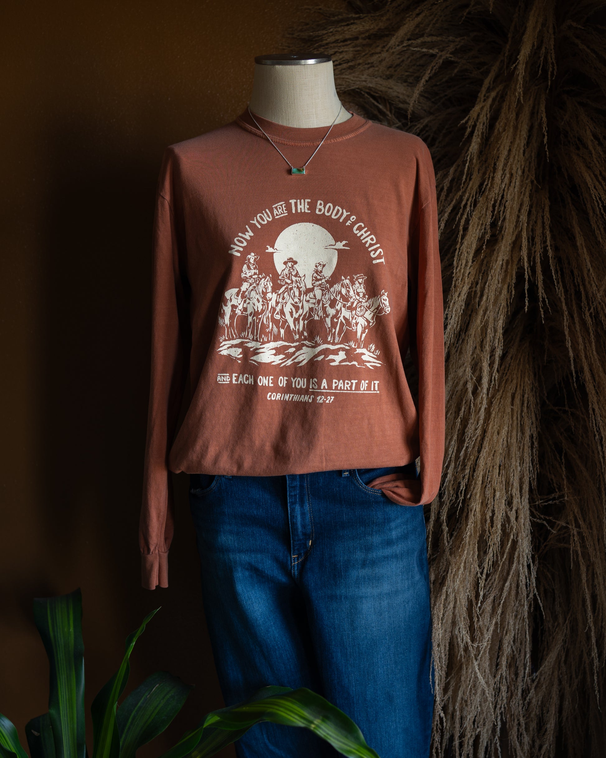 Comfort Colors long sleeve t-shirt in the color "Yam" featuring a western design by No Ego Studio.